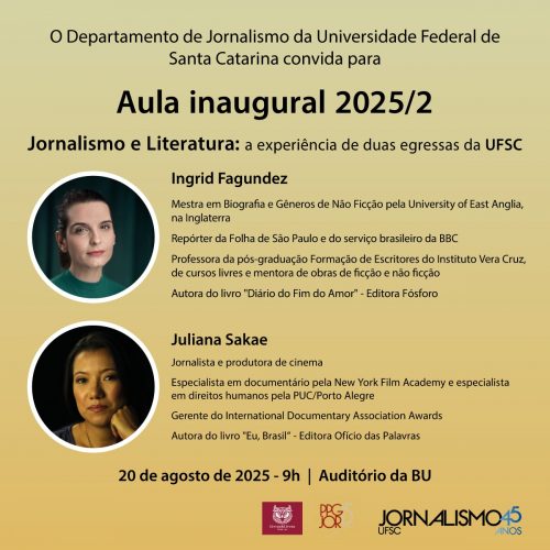 As jornalistas Ingrid Fagundez e Juliana Sakae participam da aula inaugural do segundo semestre de 2025 do Departamento de Jornalismo da UFSC, palestrando sobre o tema “Jornalismo e Literatura: a experiência de duas egressas da UFSC”. O evento tem o apoio do PPGJOR e vai acontecer no dia 20 de agosto, às 9h, no Auditório Elke Hering, na Biblioteca Universitária (BU), no campus Trindade.